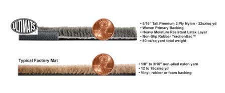 • Ultimat Carpet Layer (face): 2 pounds of premium nylon 2 ply continuous filament yarn in each square yard. Durability and density is created by twisting and heat-setting two pieces of yarn together in each woven tuft.